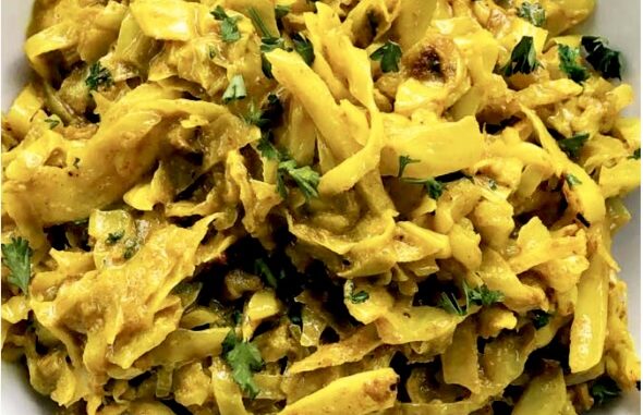 - REMOVE curried cabbage from oven, pluck out any inedibles (thyme stems, cinnamon stick, bay leaves) then toss or lightly dress with remaining marinade (optional).