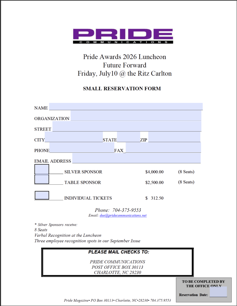 The missing element now is you. We need you to purchase your tables, tickets as soon as possible. Call the office at 704-375-9553, or log on to www.pridemagazineonline.com for more information.